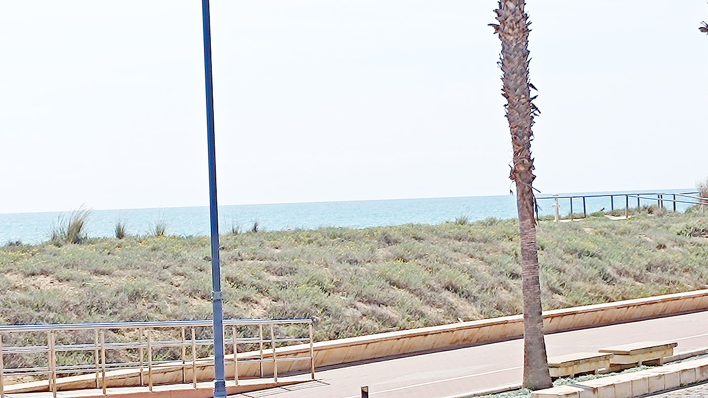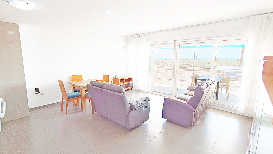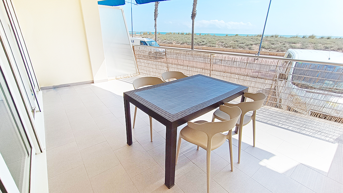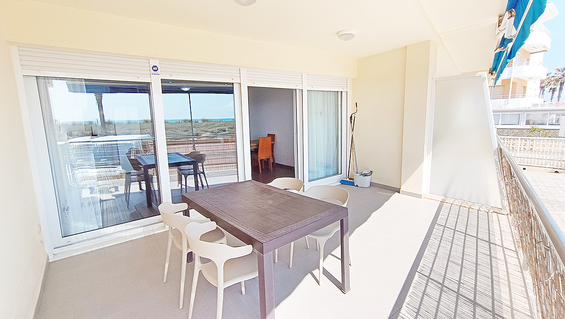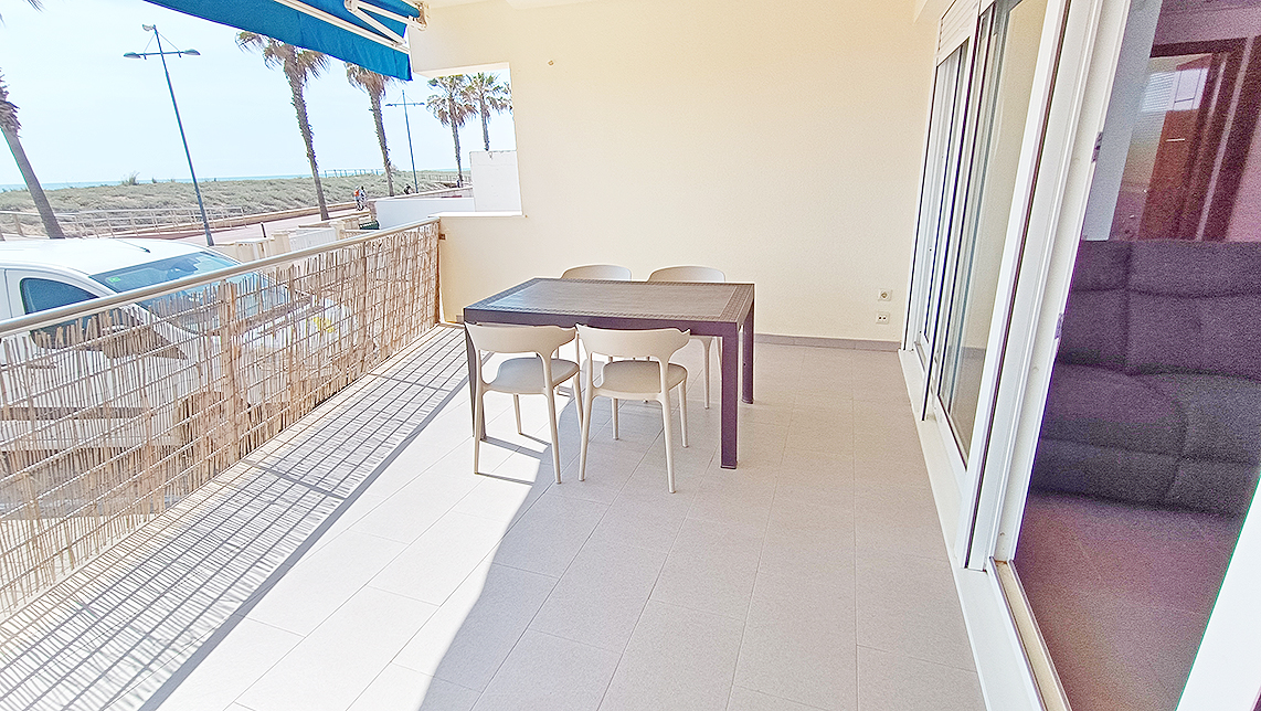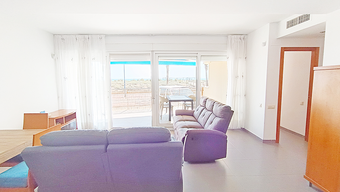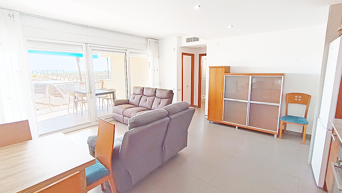 Apartamento frontal al mar de 81 m2, 2 Habitaciones, 1 baño, cocina americana, salón, ventanas de PVC oscilobatientes con doble cristal, aire acondicionado por conducto frio/calor, 2 terrazas, plaza de parking, vistas al mar, en primera línea de playa, completamente amueblado y equipado, zona tranquila, todo exterior, excelente estado acabados de calidad.